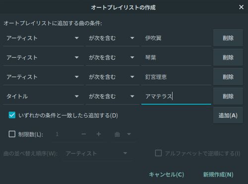 どうも,最近アイマスにハマってるJUNです. アイマスは沢山の素晴らしい曲があってとても良いですね. ふと お気に入りのアイドル達の曲ばかりが入ったプレイリストを作ろうと思ったわけです. そこでRhythmboxのオートプレイリストがプレイリストを作るのに便…