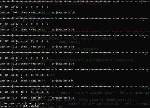 Brainfuckのインタプリタを作りました. Brainfuckって何? Brainfuckって言語です. 言語仕様とかはWikipedia参照 ja.wikipedia.org +++++++++[>++++++++>+++++++++++>+++>+<<<<-]>.>++.+++++++..+++.>+++++.<<+++++++++++++++.>.+++.------.--------.>+.>+. …