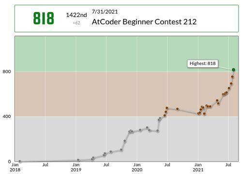 5ヶ月くらい前ですが, 2021年7月31日にAtCoder緑になったのでその振り返り記事を今更ながら書きます. JUN_NETWORKSさんのAtCoder Beginner Contest 212での成績:1422位パフォーマンス:1257相当レーティング:756→818 (+62) :)Highestを更新し、6 級になり…